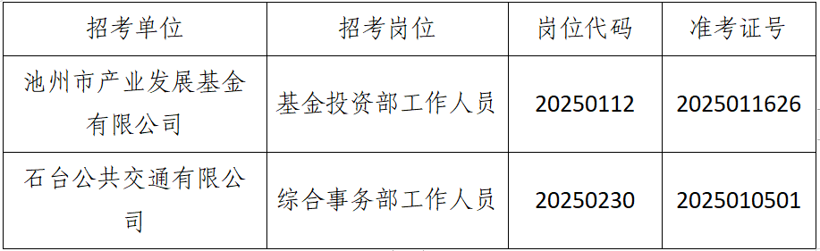 根據(jù)《池州市投資控股集團2025年公開招聘工作人員公告》要求,由于入圍現(xiàn)場資格復(fù)審的考生中有部分人員自動放棄或不合格產(chǎn)生了人員空缺,現(xiàn)按《公告》要求,在報考同崗位的考生中按筆試成績從高分到低分的順序依次遞補,成績出現(xiàn)并列者一并進(jìn)入資格復(fù)審,現(xiàn)將入圍遞補資格復(fù)審情況公告如下: