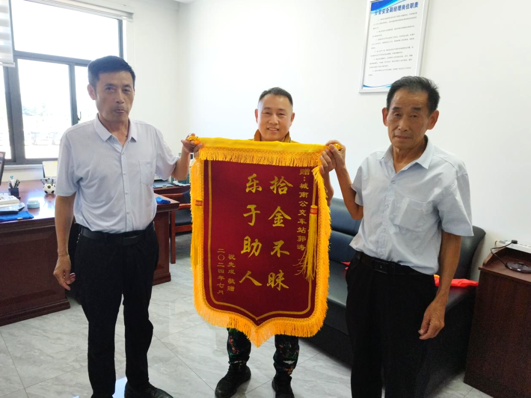 7月4日下午,東至縣木塔鄉(xiāng)居民祝先生將一面寫(xiě)有“拾金不昧 樂(lè)于助人”的錦旗送到了東至公共交通有限公司,以此向擔(dān)任縣城至利安木塔駕駛員郭濤師傅表示感謝。據(jù)了解,祝先生于3日下午乘坐縣城至利安木塔最后一班公交車(chē)回家,不慎將自己的錢(qián)包掉落在公交車(chē)上。車(chē)到目的地后,郭師傅在打掃公交車(chē)衛(wèi)生時(shí),發(fā)現(xiàn)乘客遺落的錢(qián)包,通過(guò)查看,包內(nèi)有身份證、醫(yī)療卡、銀行卡等證件和現(xiàn)金1200元。郭師傅擔(dān)心失主著急,通過(guò)身份證,輾轉(zhuǎn)找到熟悉的朋友,后又由朋友找到祝先生所在村村書(shū)記。通過(guò)村書(shū)記聯(lián)系到失主本人。在祝先生當(dāng)面表示感謝時(shí),郭師傅表示,“這都是自己應(yīng)該做的。”